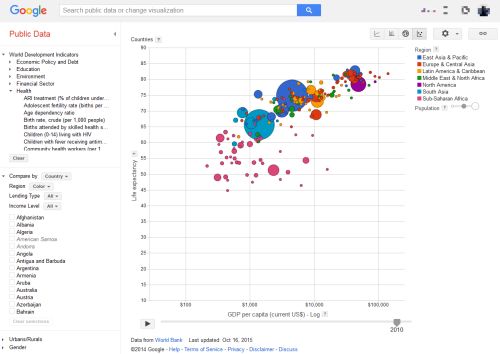 The diagram shows each country as a circle, where the size of the circle corresponds to the size of its population, the position on the x-axis corresponds to the life expectancy, and the position on the y-axis corresponds to the fertility rate. The data corresponding to the axes can be freely chosen among all data that is available in the World Bank. The time progression over the years is additionally shown as an animation. Additionally, the circles are color coded by continent.