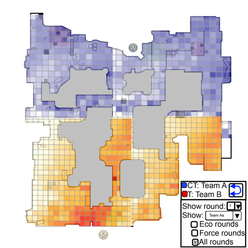 The interactive elements should allow the user to select different sets of the up to 30 rounds per game. There are "economy-rounds" ("eco") in which one of the teams didn't have enough money at the start to buy rifles, "force" rounds, where the teams doesn't have enough money to fully equip and "full-buy" rounds. Depending on their equipment I expect professional team to adapt their tactic which should be visible on the heatmap. These are the stories I want to tell.