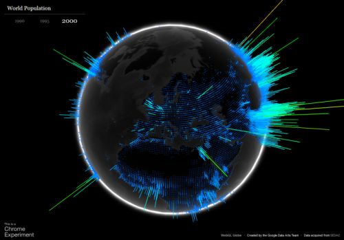 This visualization is displaying the worlds population for every approximately equally sized geographical chunk of the globe. The data can be selected for three different years: 1990, 1995, and 2000. The globe is rendered via WebGL and three.js, which allows the user to rotate the globe by dragging it with a mouse or the like.