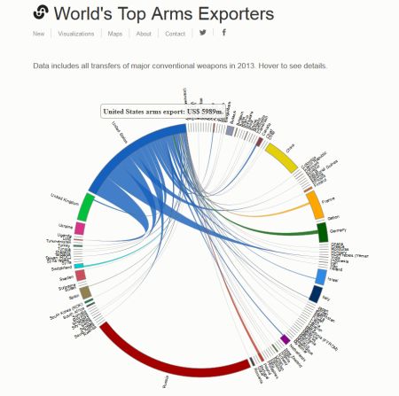 This chord diagram shows the origin and destination countries of weapon exports in 2013. It was developed by Natalia Bronshtein using d3.js and is based on data from the SIPRI Arms Transfers Database. The work is licensed under the Creative Commons Attribution 4.0 International License.