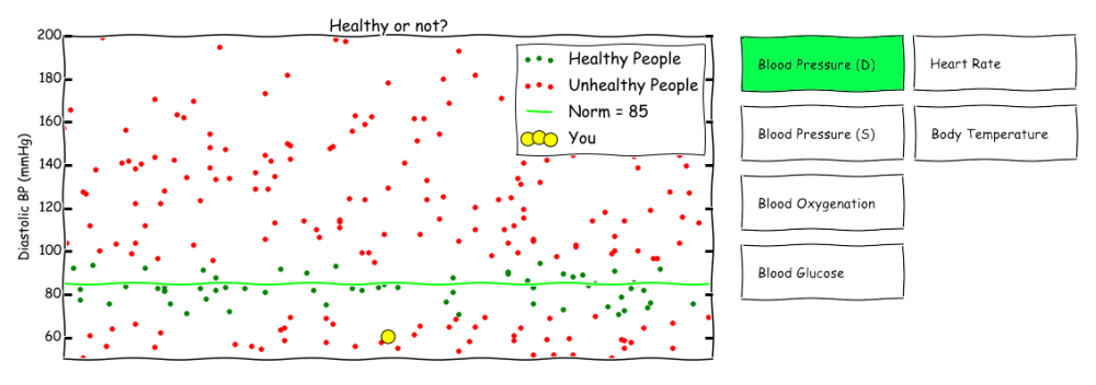 I am using the following scenario as a premise: I would like to get a dataset of measurements done by healthcare professionals or individuals with access to equipment in order to make their own measurements (e.g. blood pressure, blood glucose, body temperature, oxygenation, heart rate, etc.). Additionally, there should be some labels available, which show the current health status of the corresponding (e.g. healthy, experiencing symptom X or ill with a specific disease Y).The accompanying text should explain how to interpret the visualization and explain the controls, i.e. the interactive elements of the visualization. The interactivity could be switching between different types of measurements. At a later stage, the visualization could “follow” the development of the measurements for one specific individual.